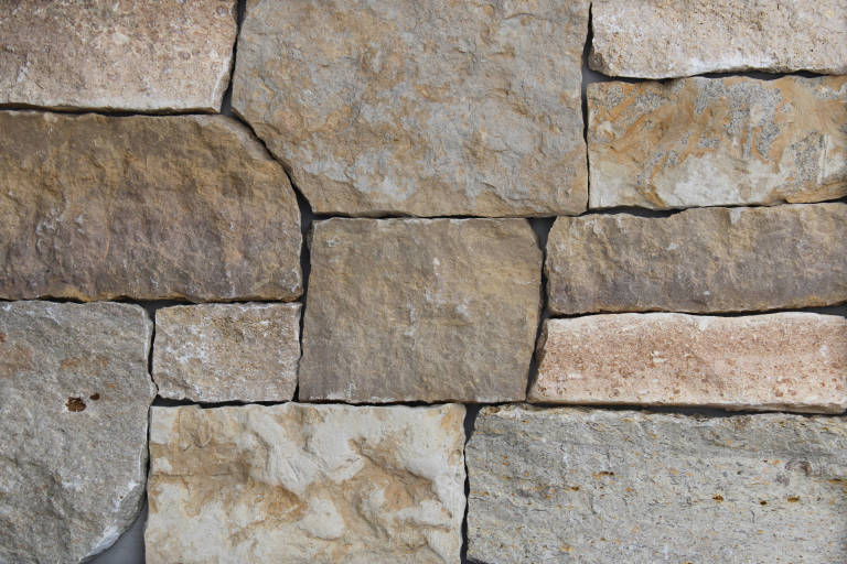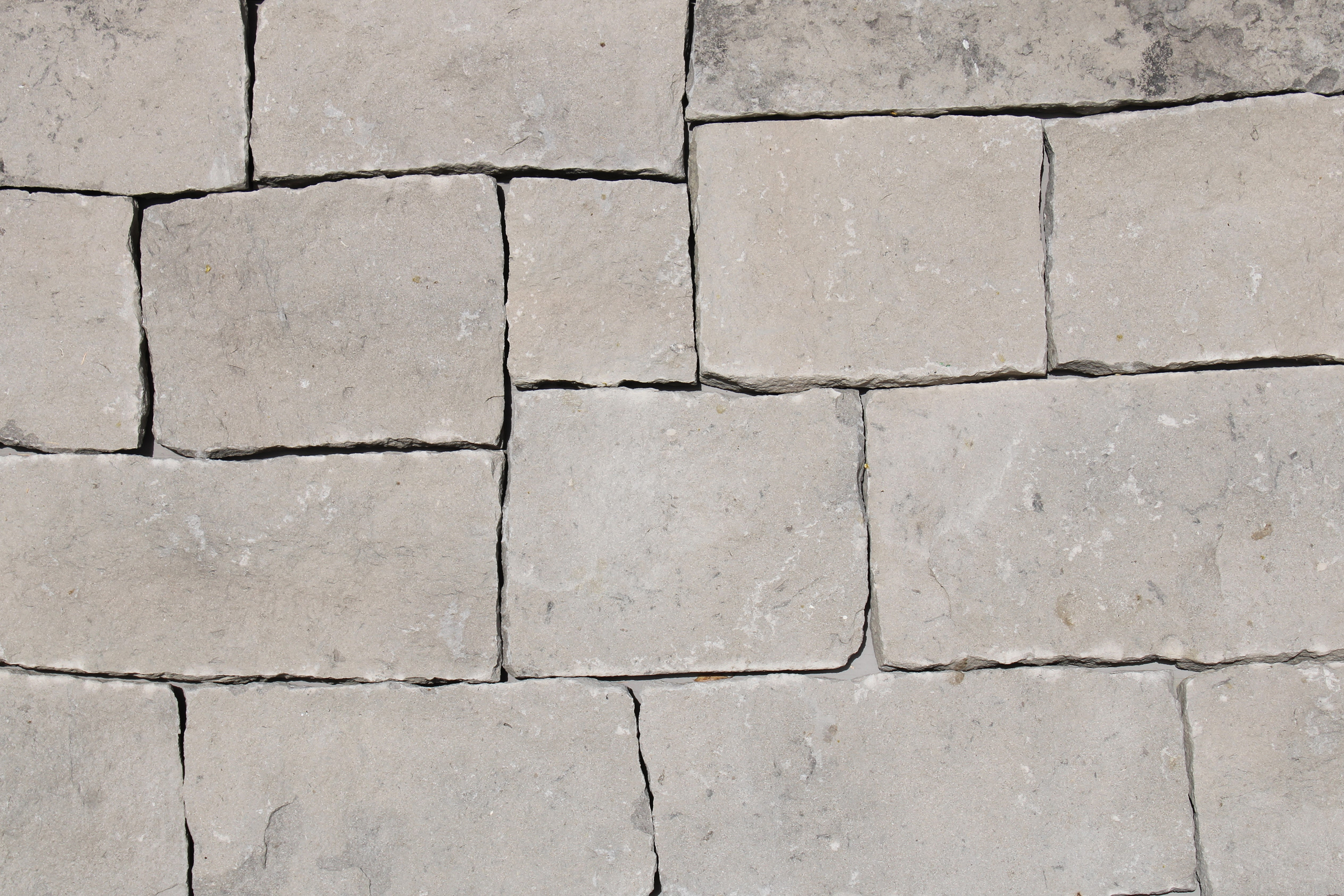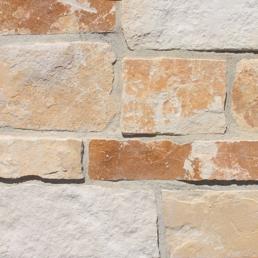 The Afina Recs stone style features rectangular stones with a rough, weathered texture and slightly irregular edges, giving a rustic, old-world aesthetic. The stones vary subtly in size and tone—ranging from light gray to beige—and are mortared with visible joints, enhancing the handcrafted look. This style emphasizes a more traditional, natural stone wall appearance.
