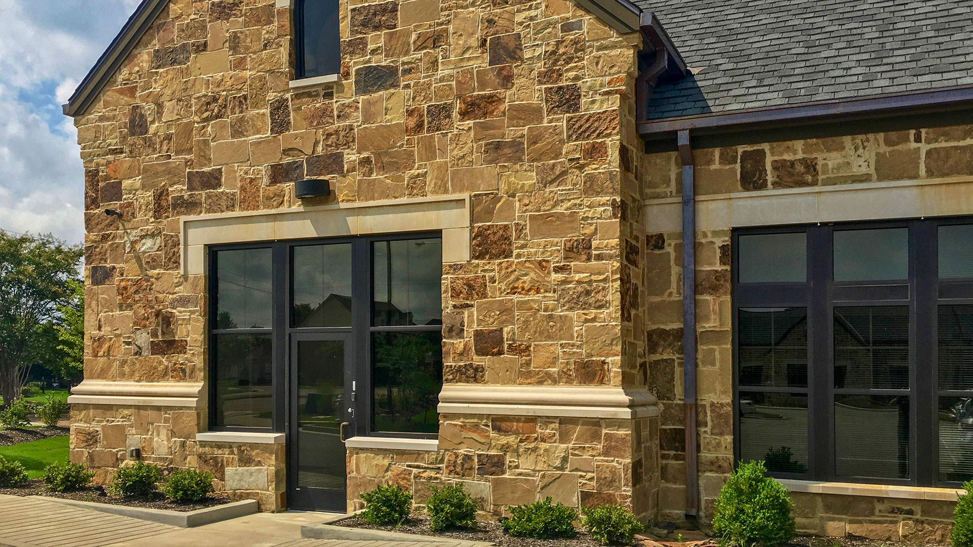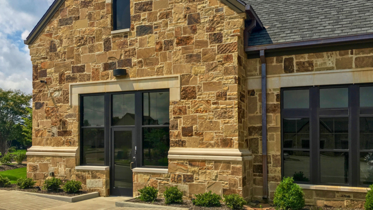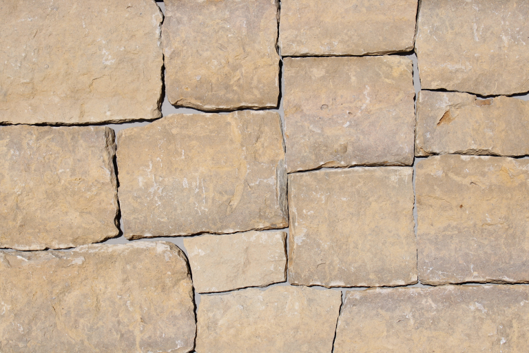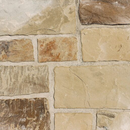 Ashwood Rubble features a mix of rectangular and irregular stone pieces in warm, earthy tones ranging from sandy beige to medium brown. The texture is slightly rough, with some stones showing subtle striations and natural veining. The color variation is mild but noticeable, giving the surface a soft, weathered look without strong contrast. Grout lines are consistent and light-colored, enhancing the natural feel while maintaining a structured pattern.