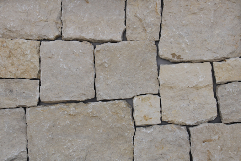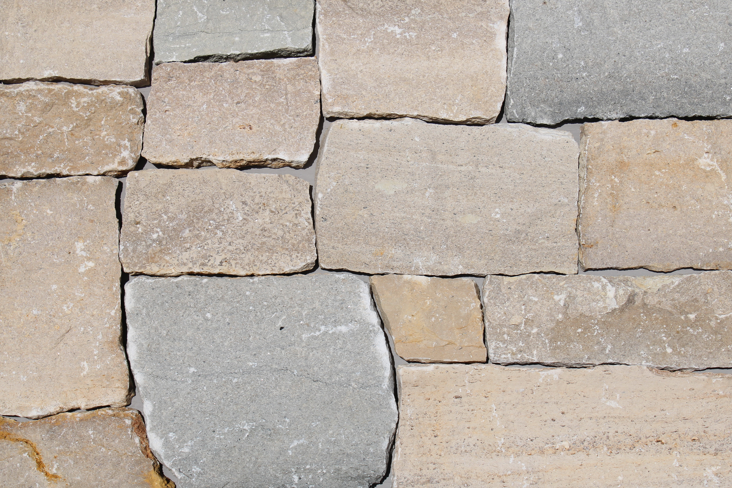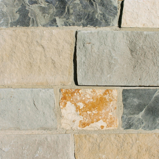 Azura Recs features rectangular blocks with a rugged texture and a highly varied color palette, including warm golds, rust tones, light grays, and soft browns. This variation gives it a more dynamic, rustic, and earthy appearance compared to the more uniform tones of Afina Recs. The mortar is visible and rough-set, reinforcing the traditional, natural stone masonry aesthetic.