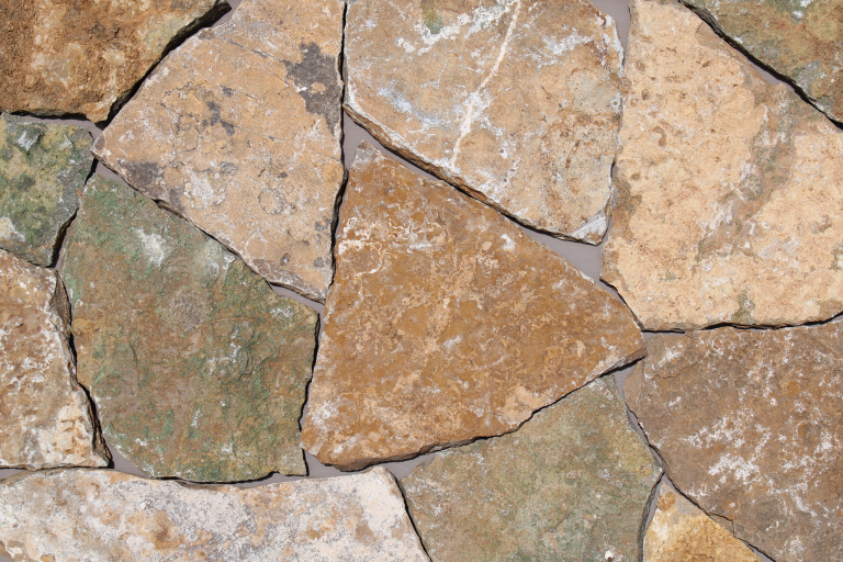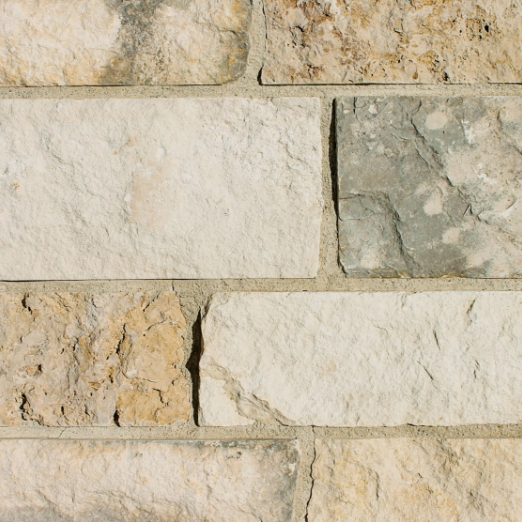 Blanco Rubble consists of light, chalky stone pieces in soft off-white and pale cream tones. The surface is rough and subtly textured, with minimal color variation across individual stones. The overall appearance is bright and uniform, creating a clean, sun-washed effect. Joint lines are filled with a light-colored mortar that blends closely with the stone, maintaining a cohesive and airy look.