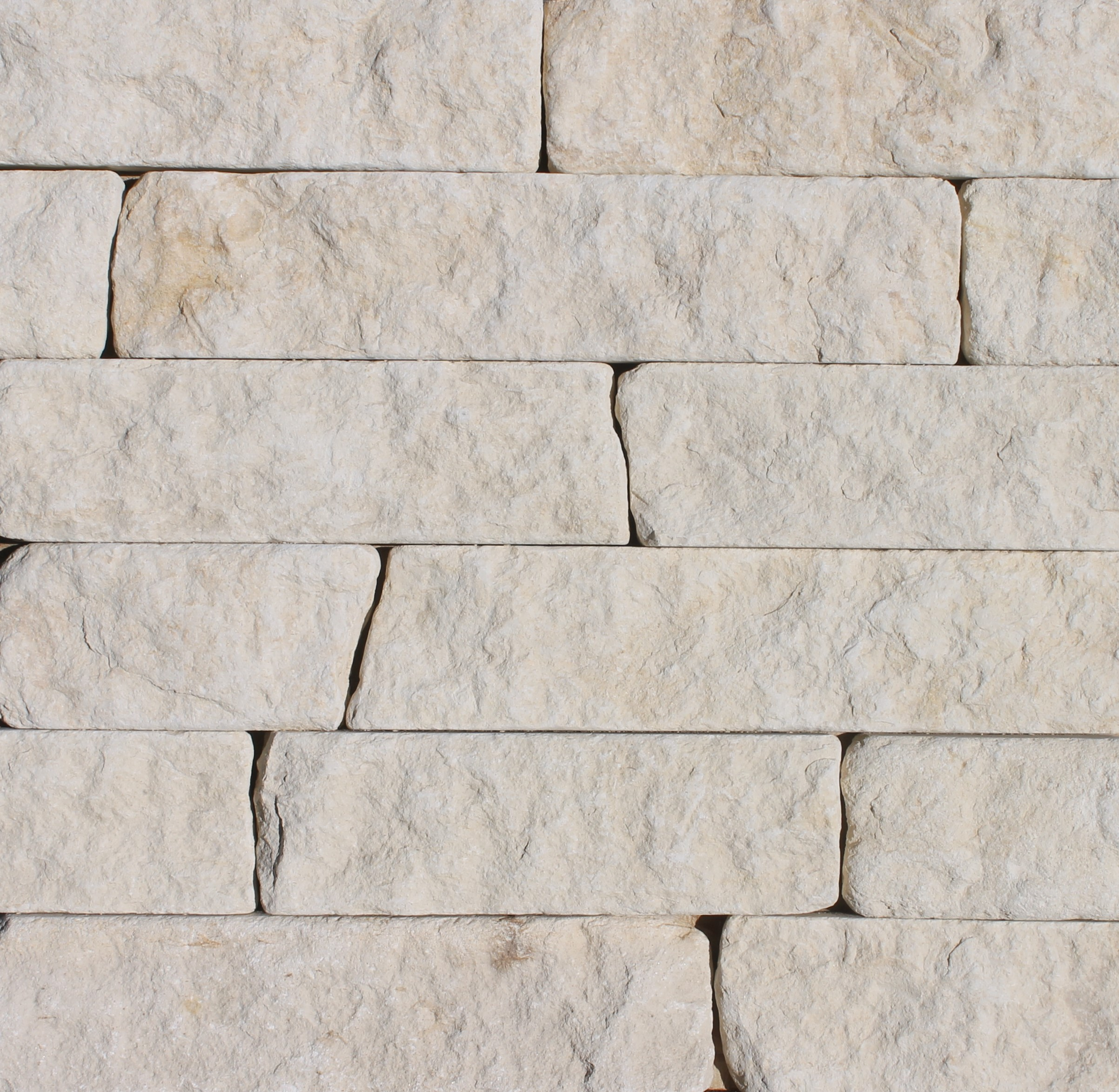 Camilla Pillowed Ledge showcases rectangular stones with a soft, rounded surface texture that gives a slightly cushioned or "pillowed" appearance. The stones are light gray with subtle tonal variations and natural surface irregularities. Vertical joints are prominent, emphasizing a stacked layout with distinct separation between pieces.