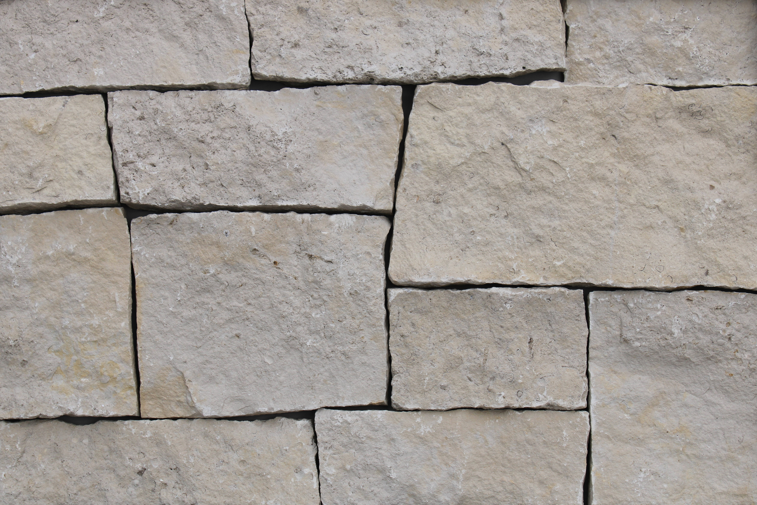 Honey Buff Rubble features a blend of soft beige and warm golden-brown stones with rough, weathered textures. The color distribution varies between creamy neutral blocks and richer honey-toned pieces, some of which show white veining or surface deposits. The stone shapes are mostly rectangular and laid in a structured but organic pattern. Mortar lines are light and clean, allowing the natural warmth and tonal variation of the stone to stand out.