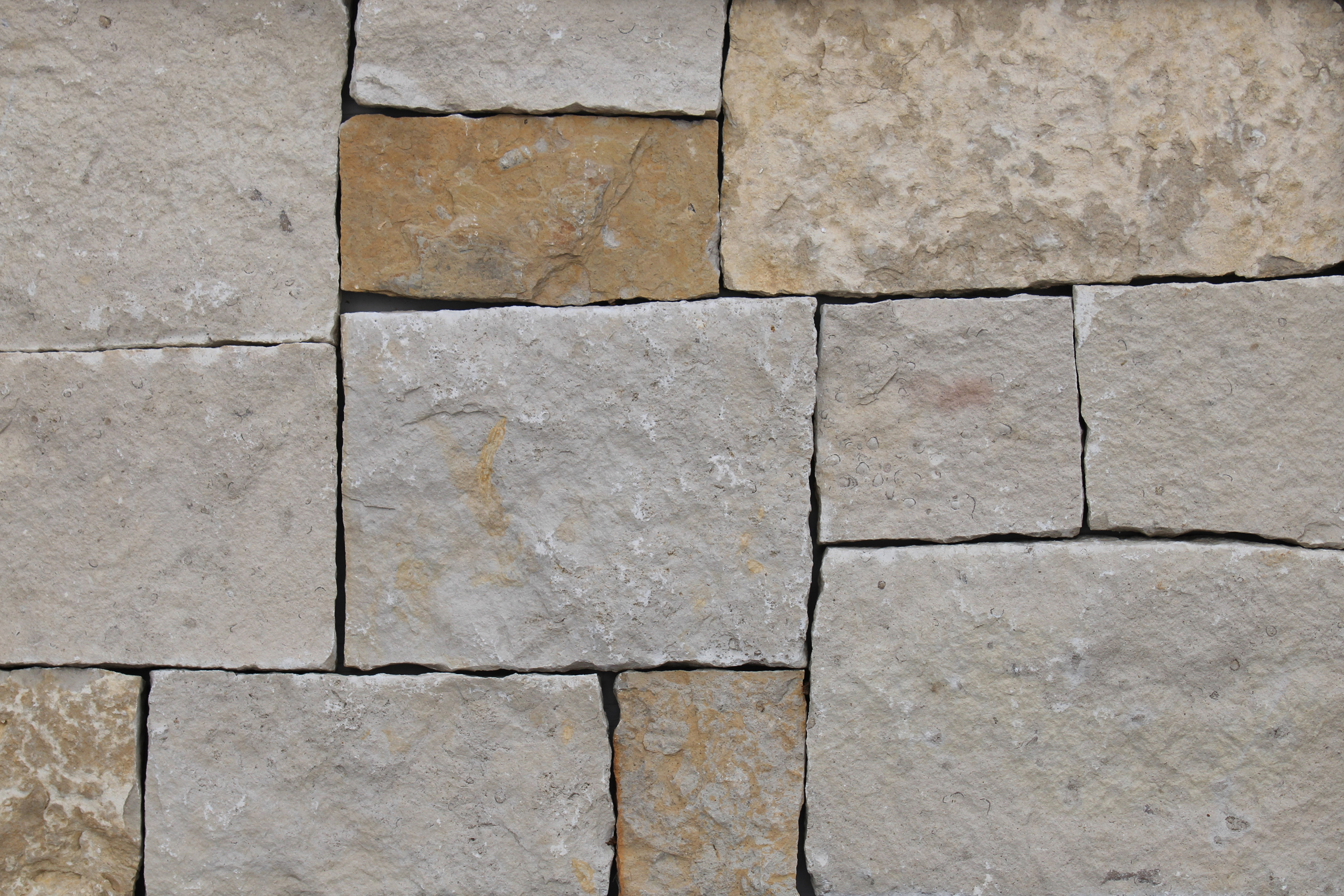Honey Buff Rubble features a blend of soft beige and warm golden-brown stones with rough, weathered textures. The color distribution varies between creamy neutral blocks and richer honey-toned pieces, some of which show white veining or surface deposits. The stone shapes are mostly rectangular and laid in a structured but organic pattern. Mortar lines are light and clean, allowing the natural warmth and tonal variation of the stone to stand out.