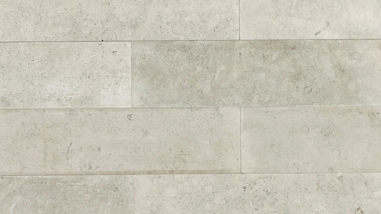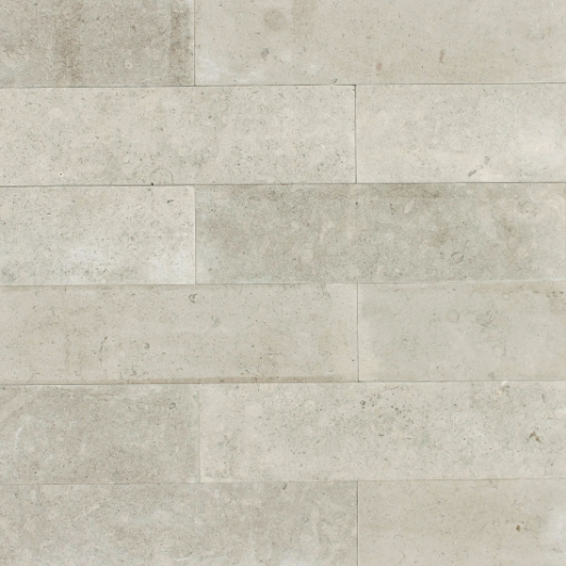Maya Neo Planks feature long, clean-lined rectangular slabs with a smooth, consistent surface and subtle textural movement. The color is a soft, light gray with occasional fossil-like markings and slight tonal variations across the face.