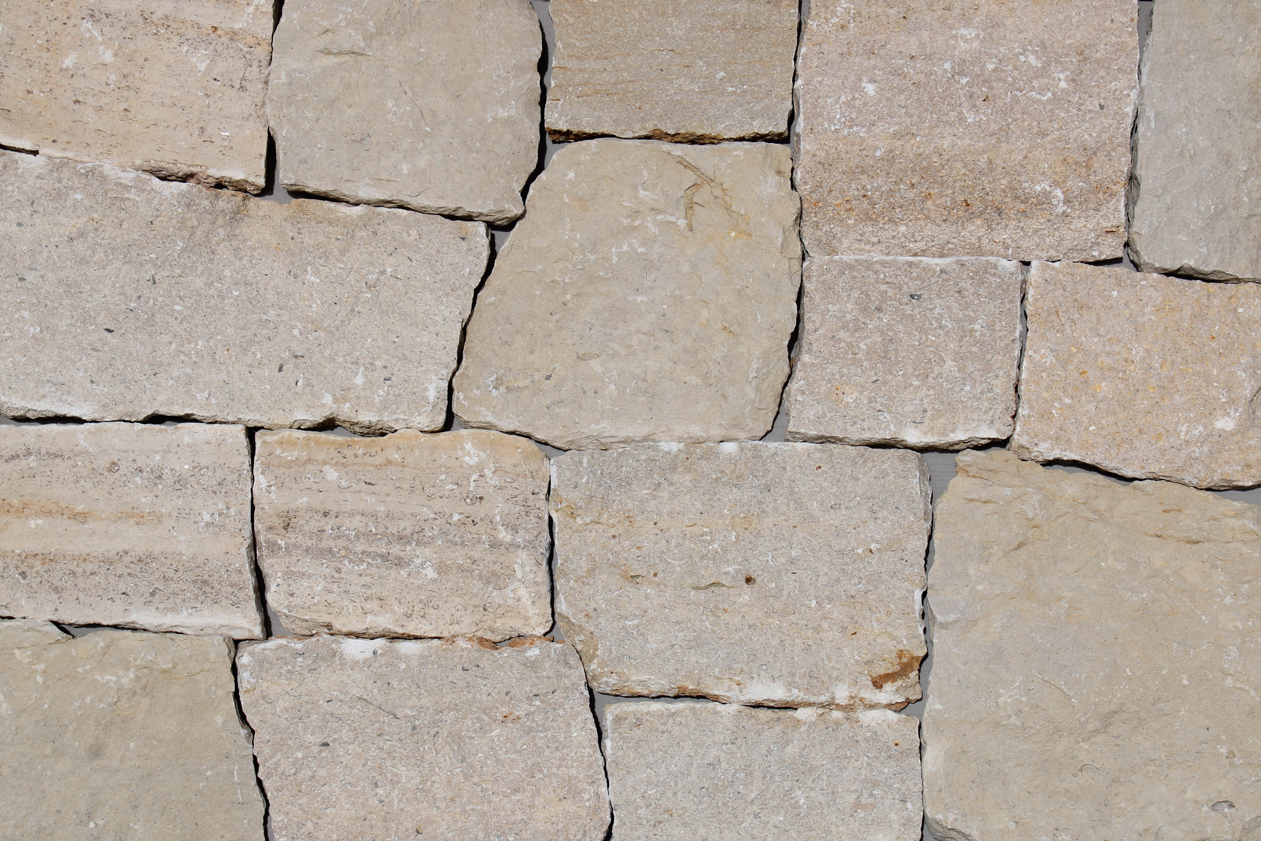 Monteverdi Rubble features softly textured stones in pale, creamy beige and light gray tones. The shapes are irregular and organic, with a mix of rounded and angular edges that give the layout a natural, unstructured feel. Surfaces appear weathered but not heavily textured, with subtle color shifts and occasional white mineral streaks. The mortar is light and clean, blending smoothly with the overall muted palette.