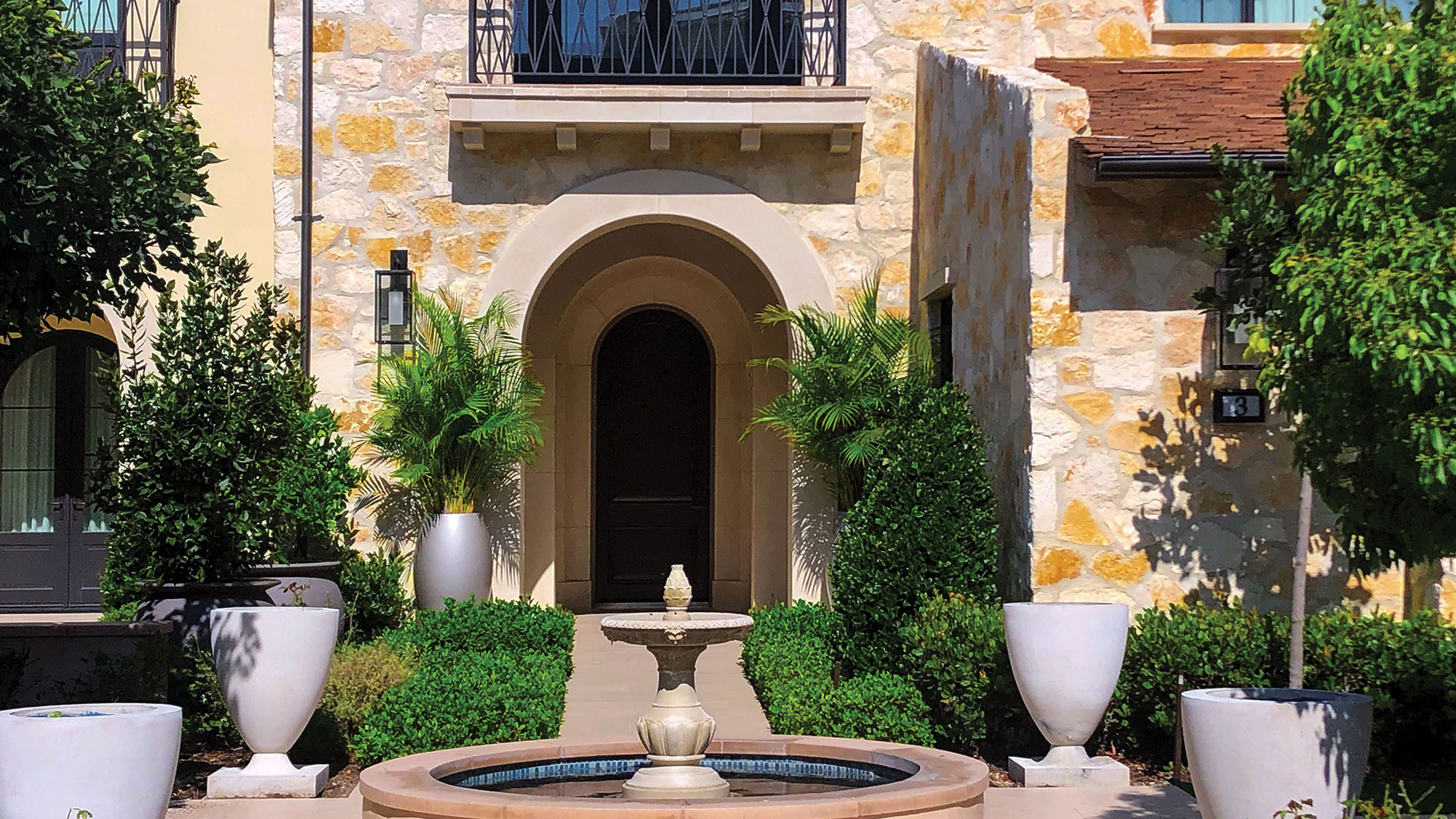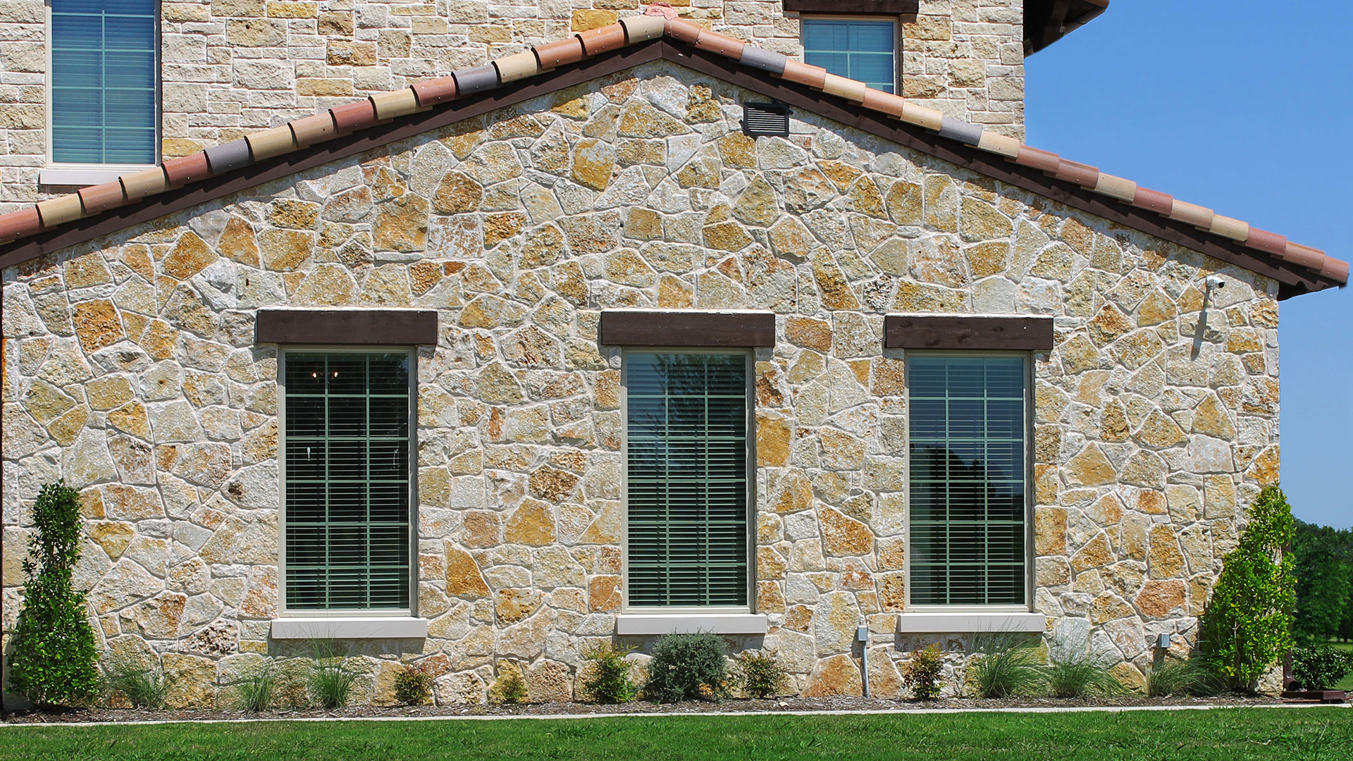 Montgomery Gold Rubble features rectangular stone pieces in warm shades of gold, tan, and light cream. The surface textures range from smooth to slightly rough, adding visual interest. Occasional white patches and soft veining break up the warmer tones.